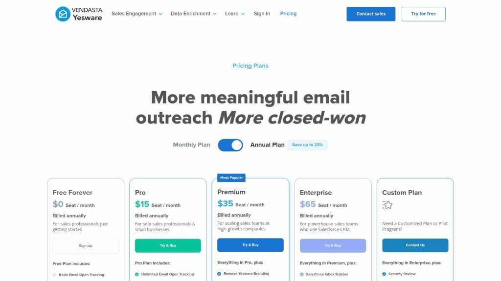 With Yesware, you don’t have to install a new system as it embeds itself within your existing email framework, considering itself as an advanced productivity tool for Gmail and Outlook. Yesware aims for individual sales professionals and SMBs trying to enrich their inboxes with vital outreach capabilities with an easy onboarding experience, as it offers email tracker, email templates, and multi-touch campaigns directly within a familiar environment. Yesware greatly simplifies workflow in sales while working in your preferred email system.