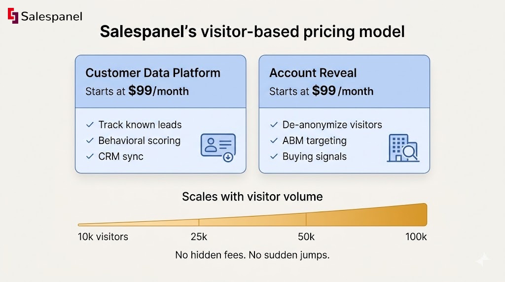 - Salespanel: Scales based on inbound volume—the number of unique visitors to your website. A plan for 25,000 monthly visitors would cost approximately $199/mo. It excels at scaling the analysis of your existing audience.