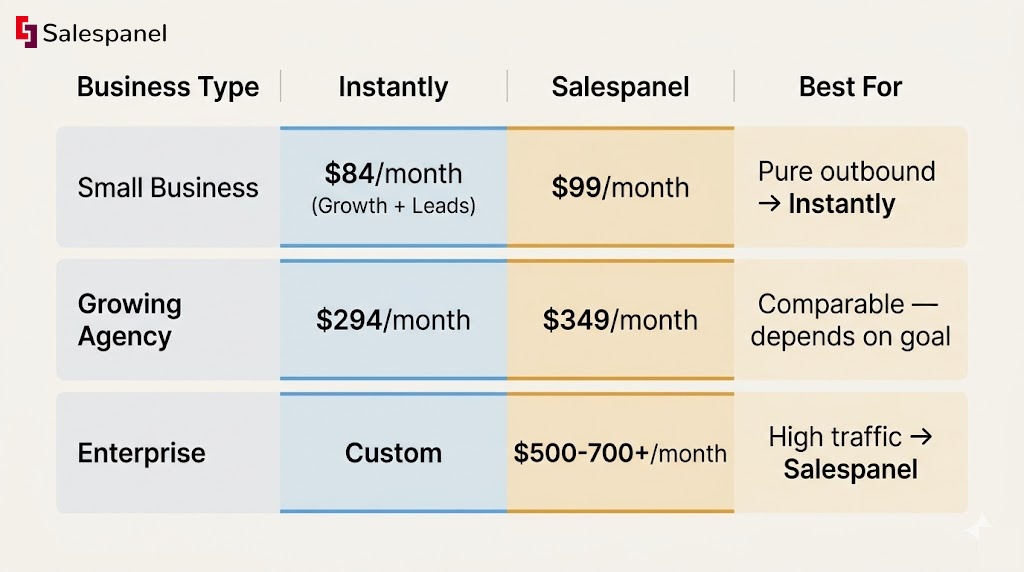 A true comparison goes beyond the sticker price. It requires a technical analysis of what each dollar invested returns in terms of features, scale, and strategic alignment. Instantly and Salespanel are built on opposing philosophies of growth: one is about manufacturing opportunity from scratch, while the other is about capturing and converting existing demand.