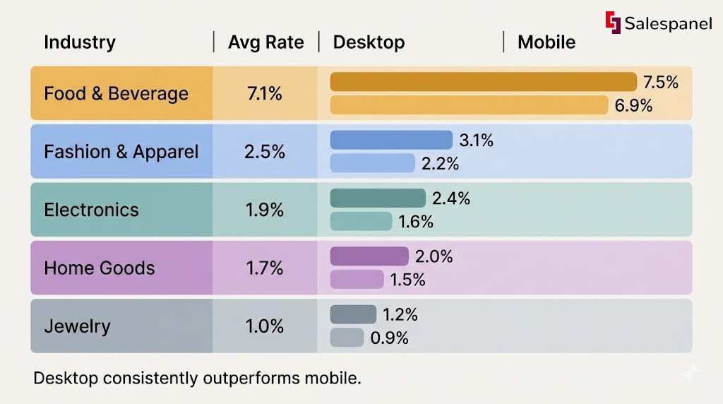 A comparison of typical conversion rates across different e-commerce sectors and how user device impacts performance.