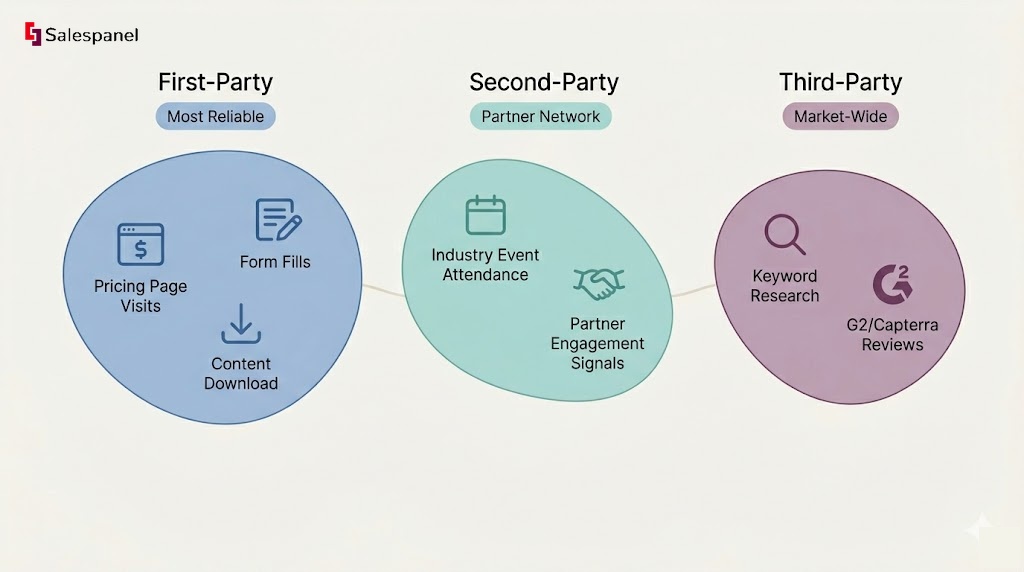 Not all intent signals are created equal. They are typically categorized based on their origin, with each type offering a distinct level of insight into the buyer’s journey.