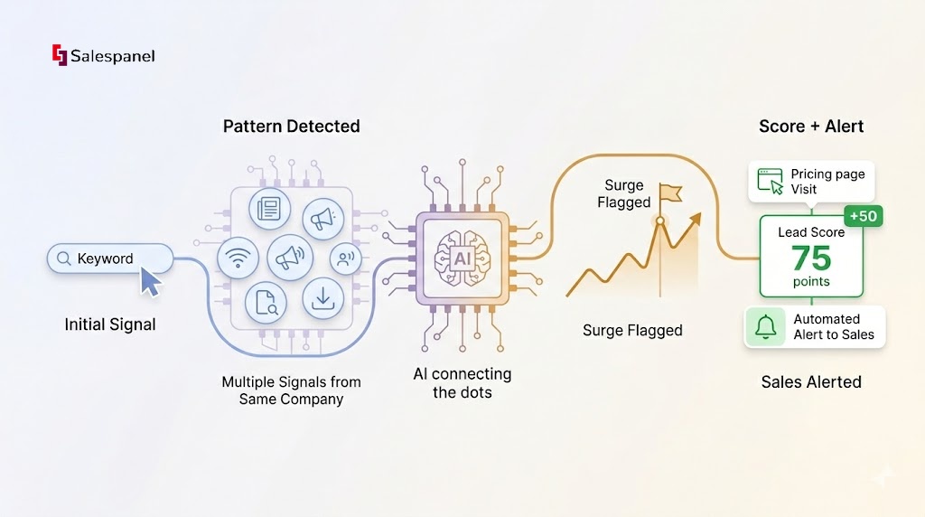 - Pattern Recognition: Over the following week, the system detects several other employees from the same company reading software reviews and visiting competitor websites related to cloud infrastructure. The AI connects these individual activities at the account level.